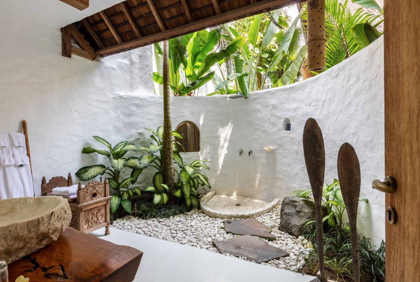 Diantaranya penggunaan bambu untuk saluran air atau kamar mandi luar yang lebih dekat dengan kawasan sawah, lengkap dengan pancuran.
